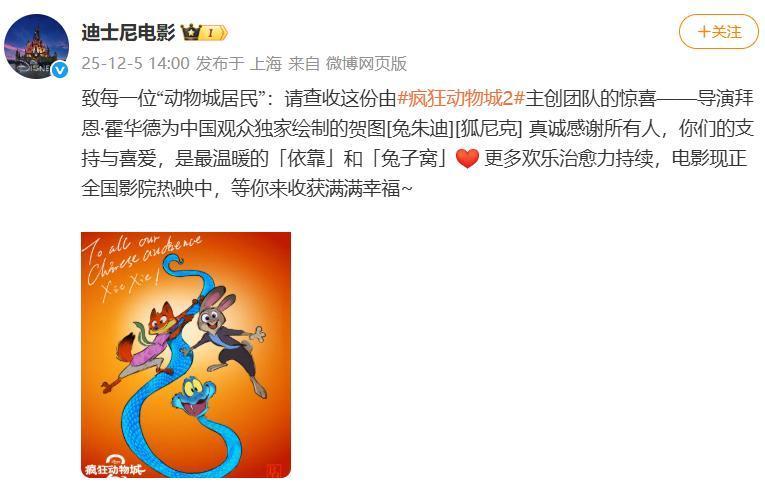 12月5日,@迪士尼影业在社交平台晒图,称《疯狂动物城2》导演拜恩·霍华德为中国观众独家绘制了贺图,图中配文 “Xie Xie!”