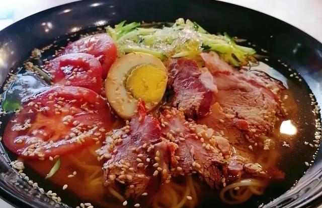 东北的大冷面所选用的面条是黑黝黝的荞面,这种面条吃起来劲道弹牙,煮好的荞麦面条过凉后浇入冰镇的牛骨清汤,然后加入酱牛肉、溏心鸡蛋、辣白菜和熟芝麻等食材。这样一碗大冷面汤汁酸甜开胃,入口清凉解暑,三伏天里没有食欲时来上一碗,可以瞬间开胃提神。