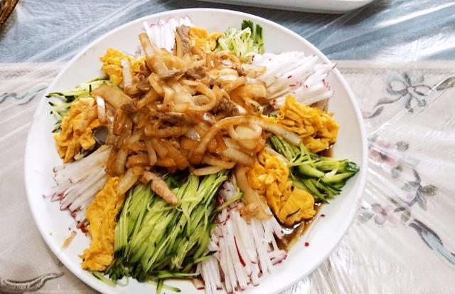 拍黄瓜拌拉皮是东北人再普通不过的家常凉菜,不过也有把拉皮做成高大上的凉菜的,也就是用拉皮垫底,上面码上各种蔬菜丝和蛋皮丝,再炒个圆葱肉丝盖个帽,调味上必须要突出酸、辣、香、呛,因此芥末和芝麻酱是拌东北大拉皮都是必不可少的调料。