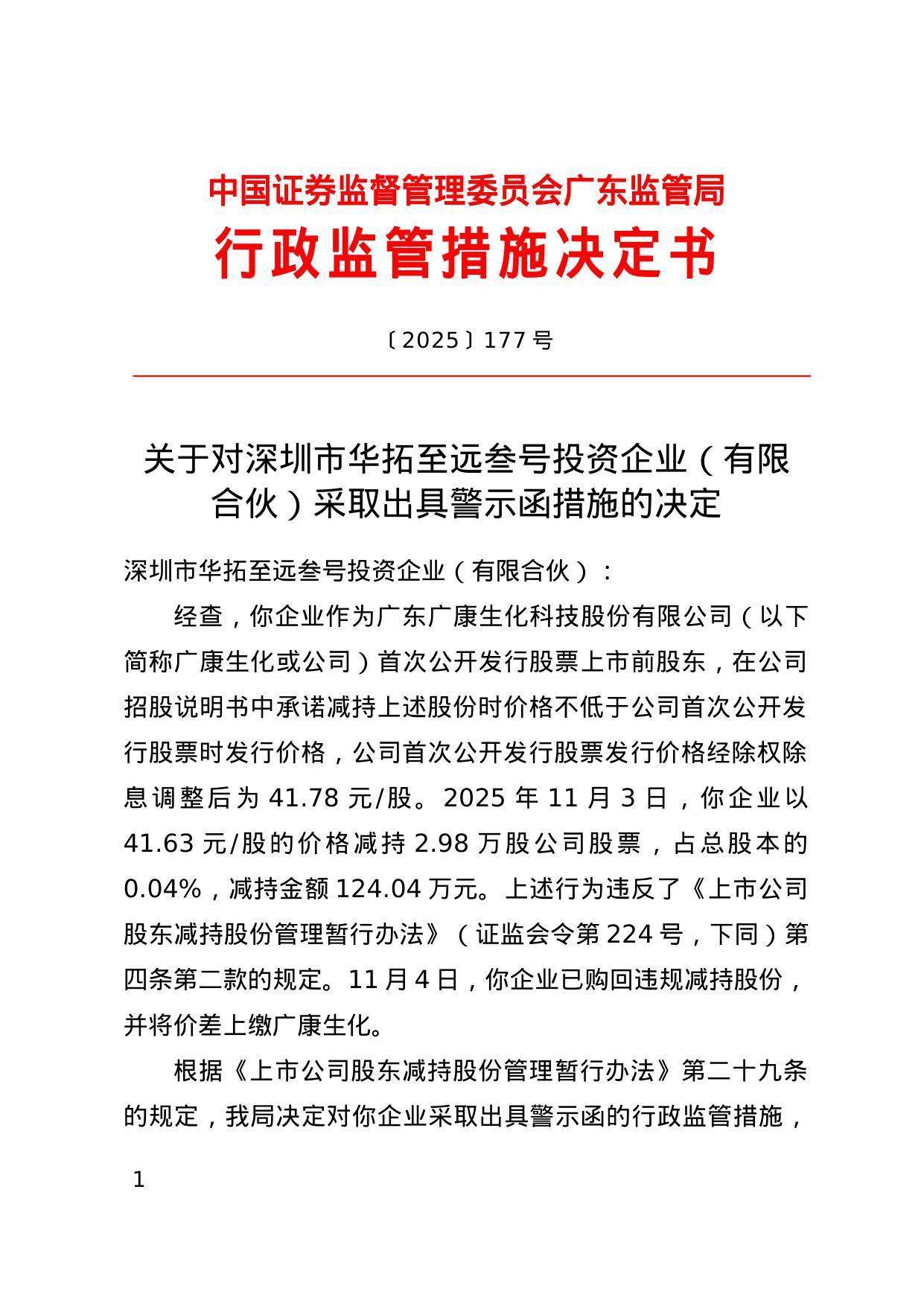 决定书显示,深圳市华拓至远叁号投资企业(有限合伙)作为广东广康生化科技股份有限公司首次公开发行股票上市前股东,在公司招股说明书中承诺减持上述股份时价格不低于公司首次公开发行股票时发行价格,公司首次公开发行股票发行价格经除权除息调整后为41.78元/股。