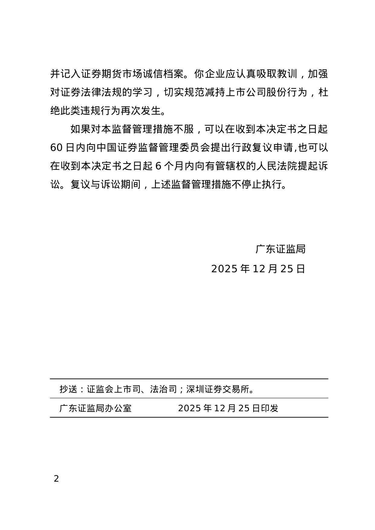 2025年11月3日,企业以41.63元/股的价格减持2.98万股公司股票,占总股本的0.04%,减持金额124.04万元。上述行为违反了《上市公司股东减持股份管理暂行办法》的规定。11月4日,企业已购回违规减持股份,并将价差上缴广康生化。